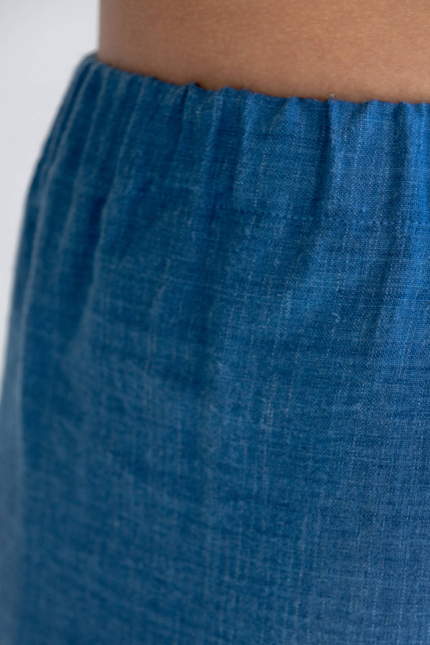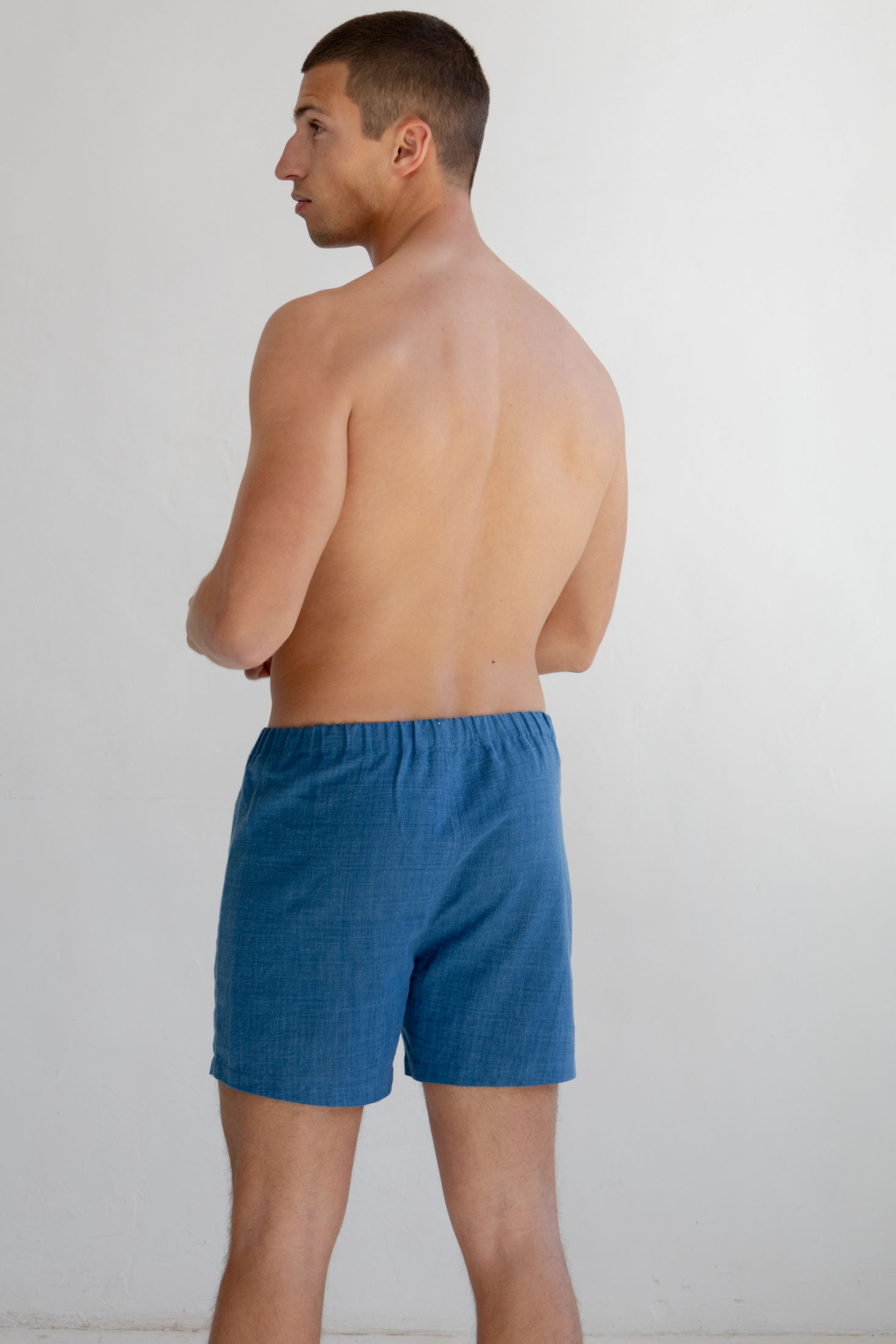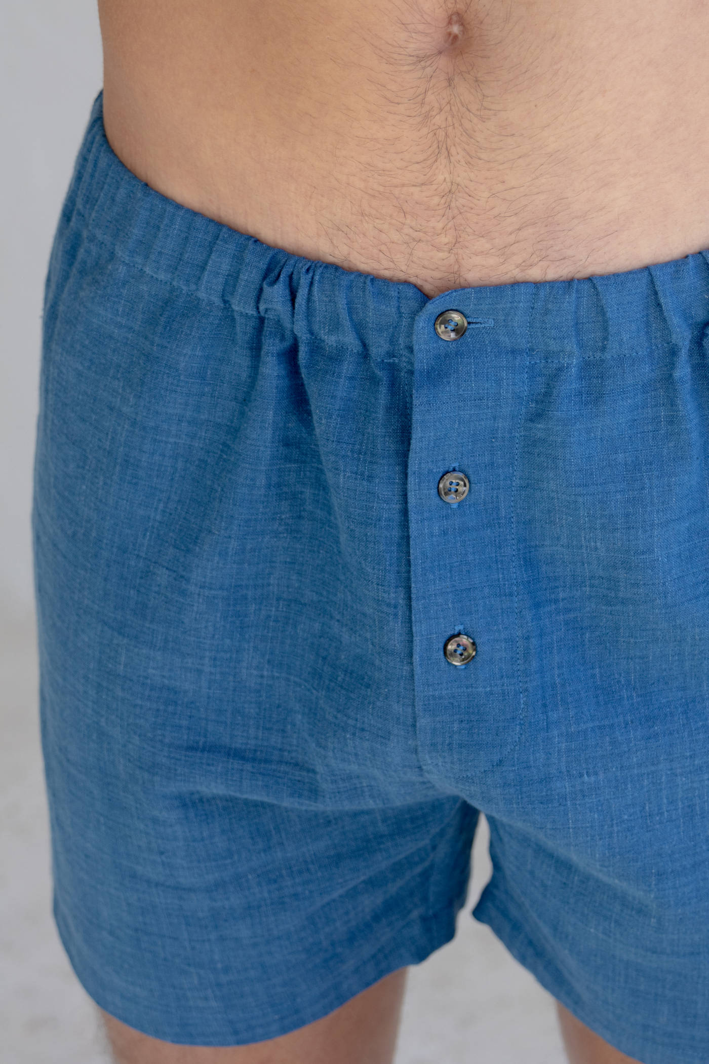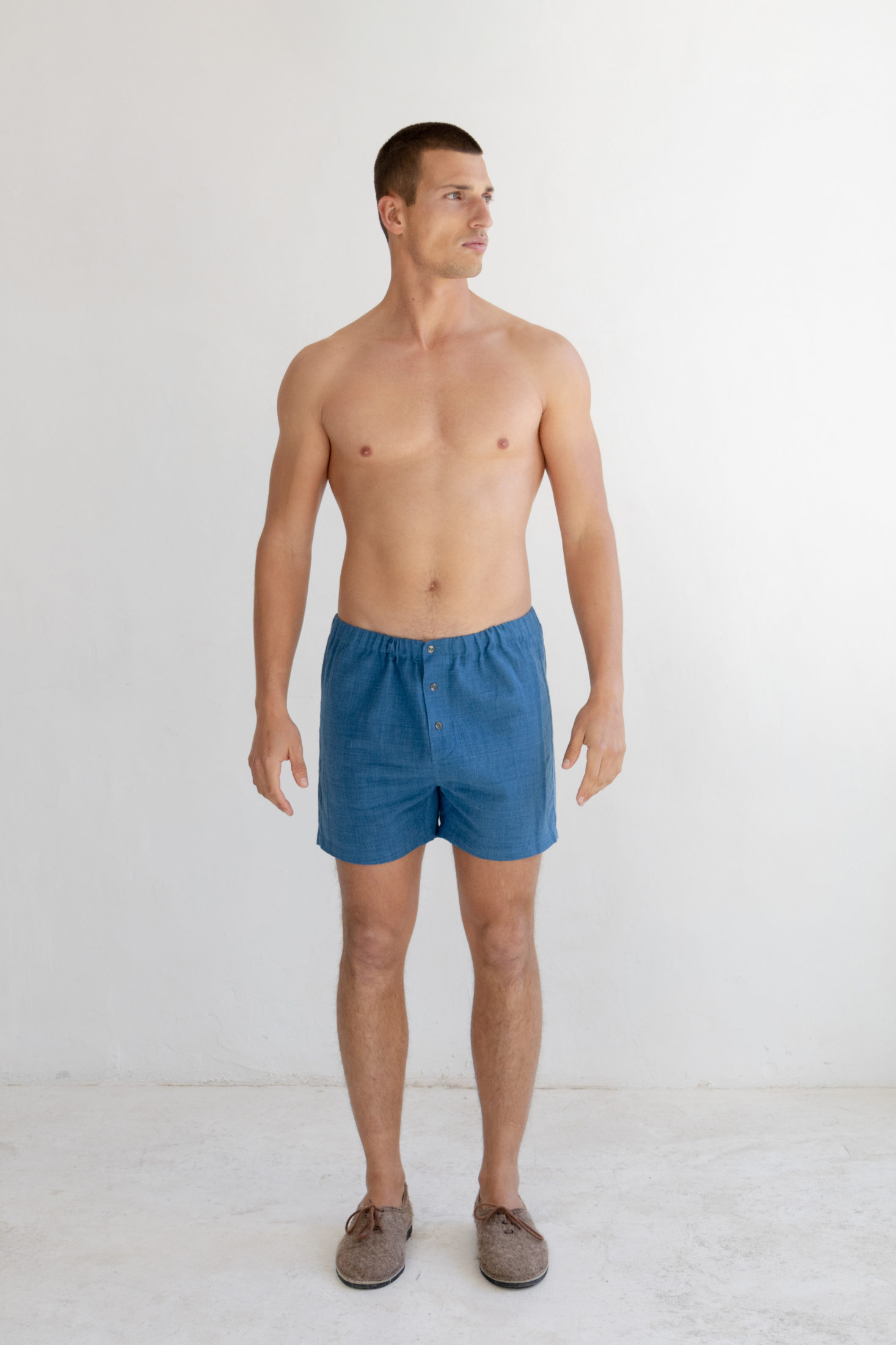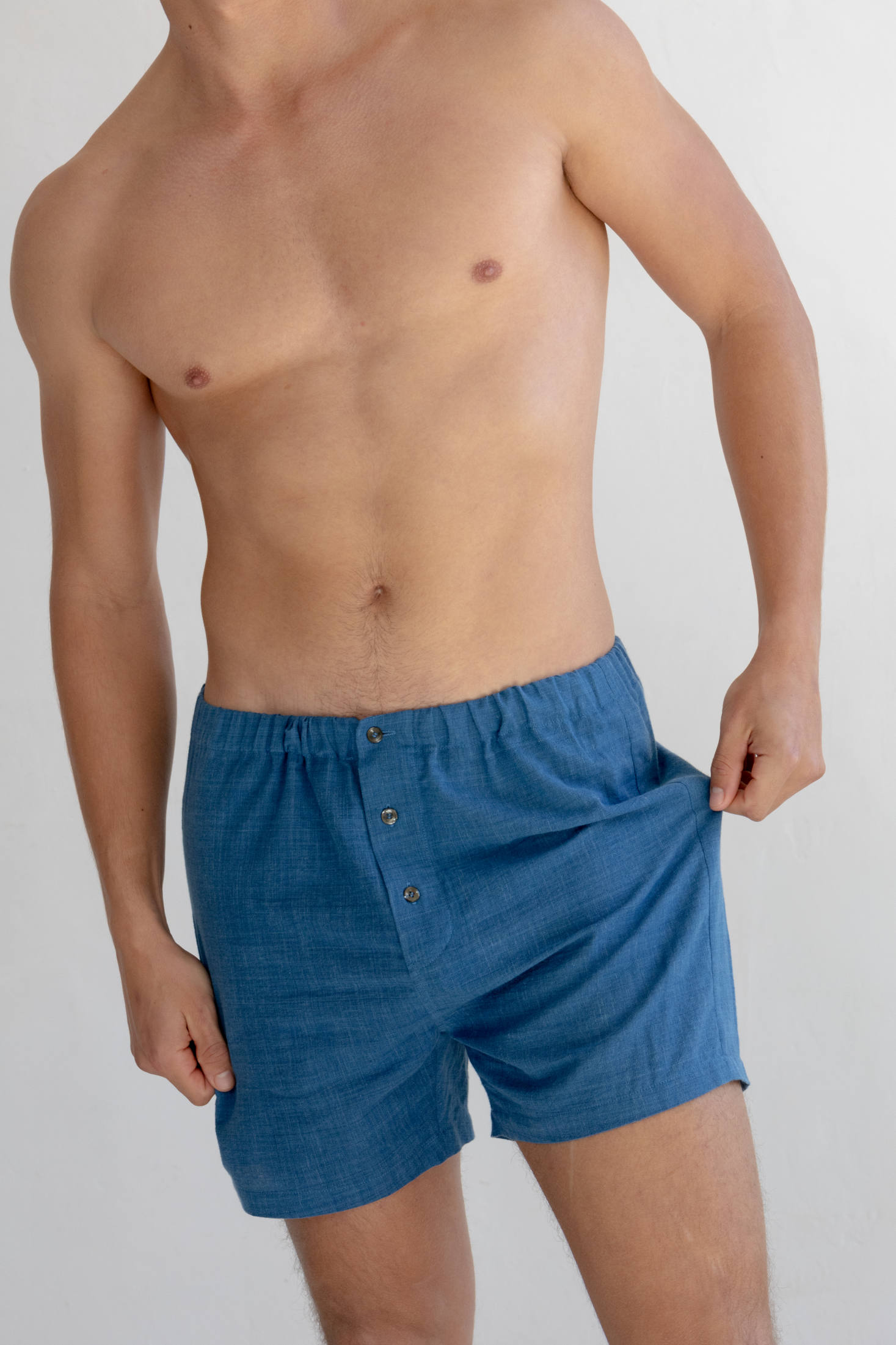 Three-button boxer shorts in a light and soft hand woven cotton fabric in natural indigo colour. The front opening uses mother of pearl buttons. These boxer shorts are hand made to order in our studio. Contact us for approximate delivery time.