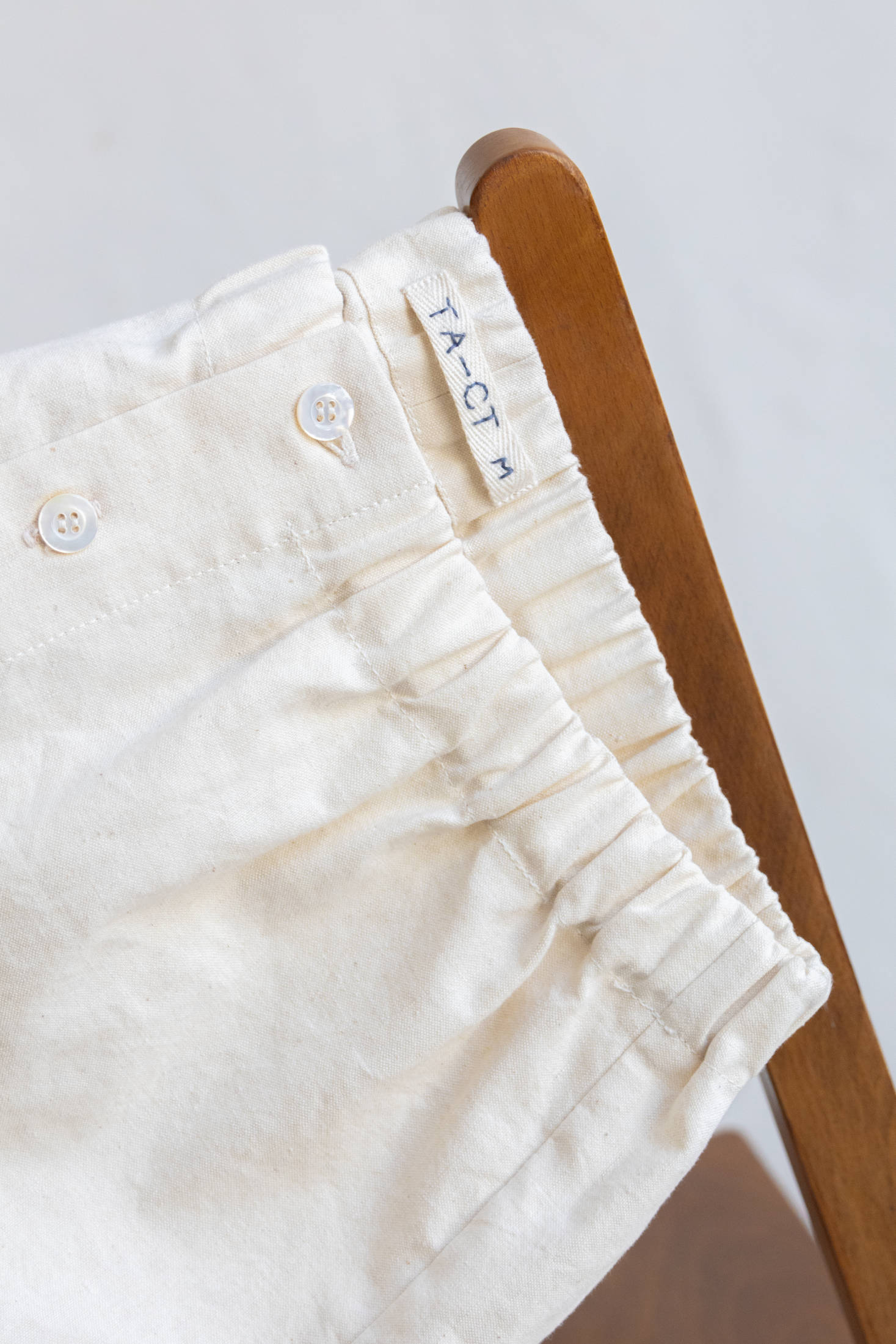 Three-button boxer shorts in a vintage medium weight French Métis fabric in off white colour. This fabric is new old stock (NOS) sourced from bed sheets in linen / cotton made in the 60s. The front opening uses mother of pearl buttons. These boxer shorts are hand made to order in our studio. Contact us for approximate delivery time.