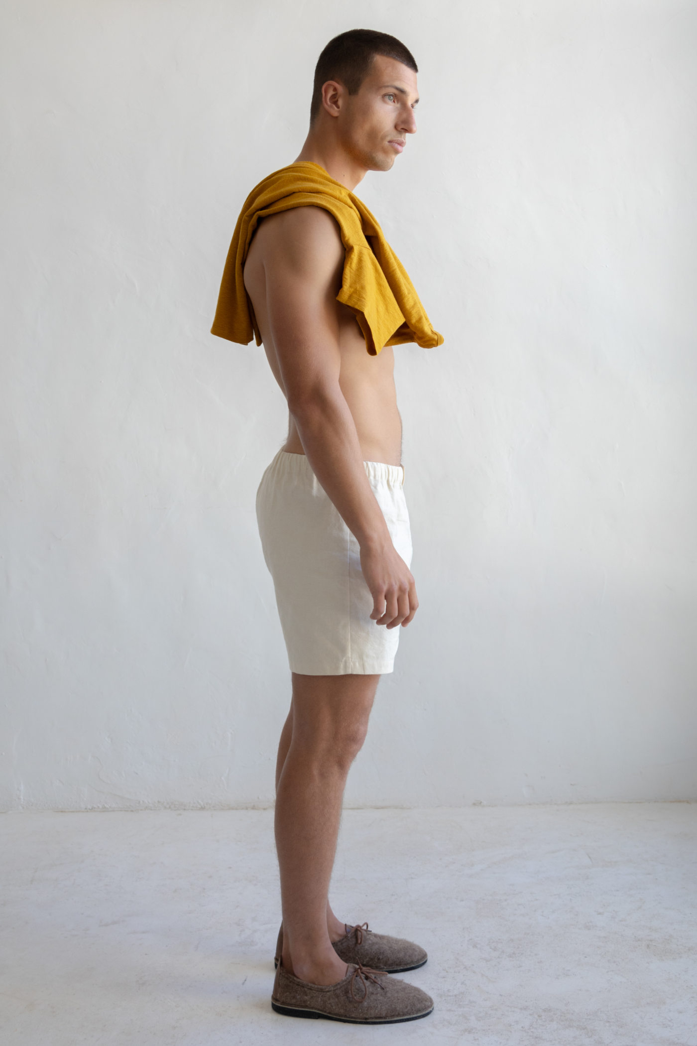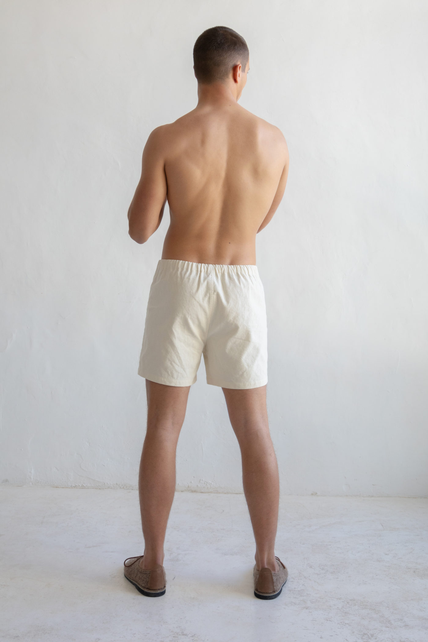 With these boxer shorts we have played with four contrasting fabrics, ranging from an extra-soft, lightweight cotton hand-spun and hand-woven by an artisan in Bengal to a rustic and luxurious antique pure hemp sourced in Italy.