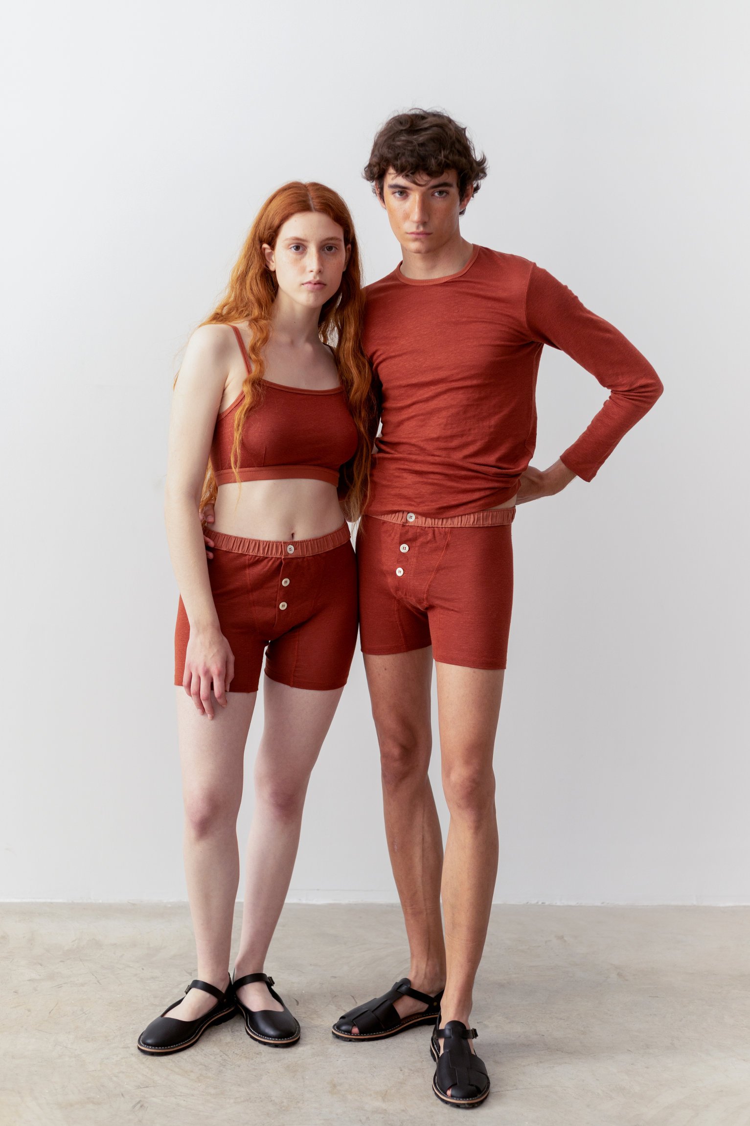 Boxer shorts with a three-button opening. Originally designed for women inspired by men’s Long Johns. This gives a good fit for any gender with an androgynous look.