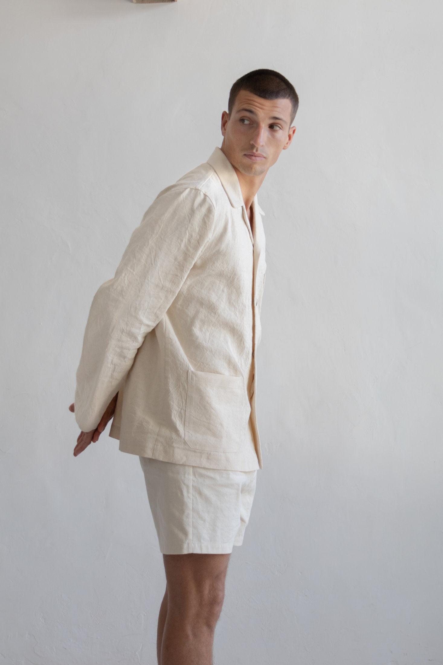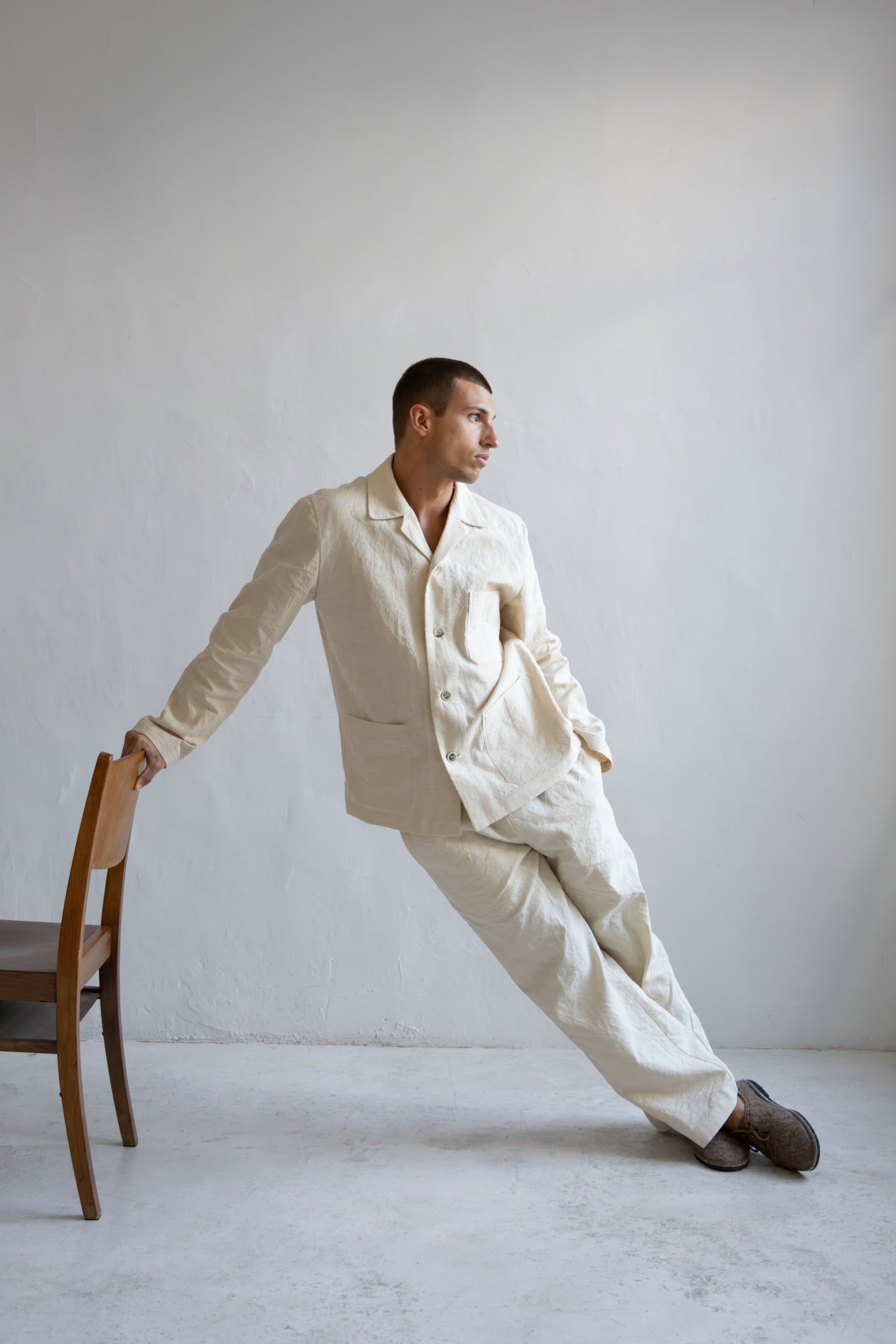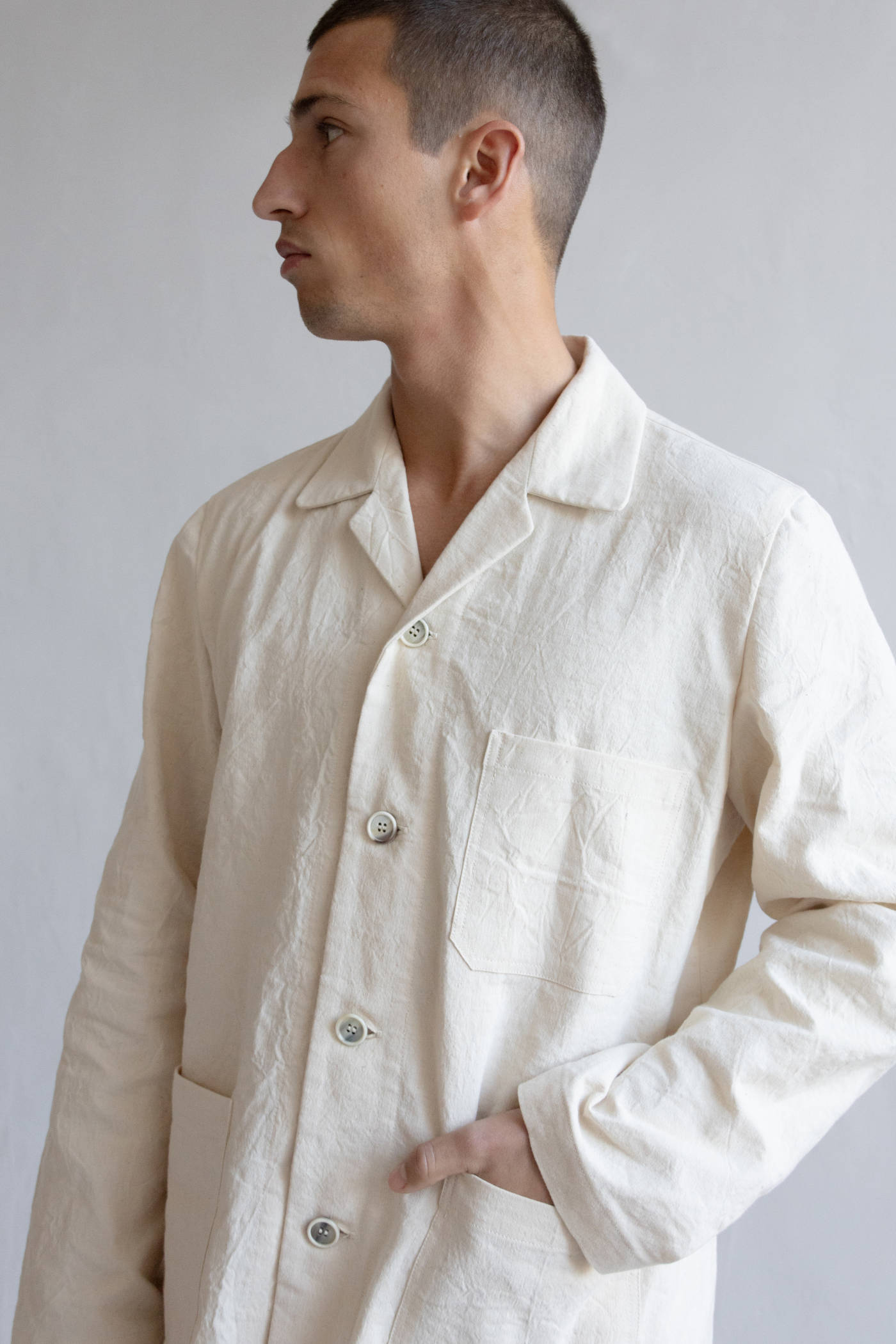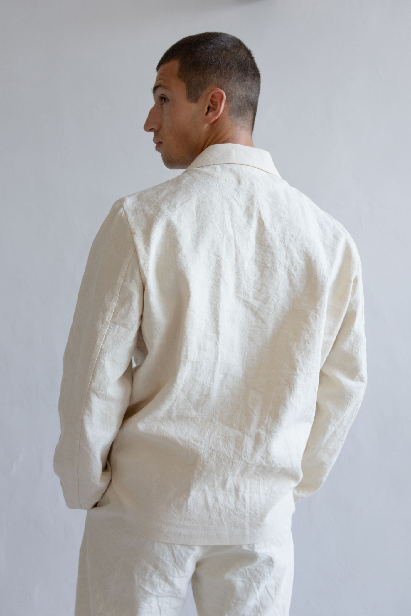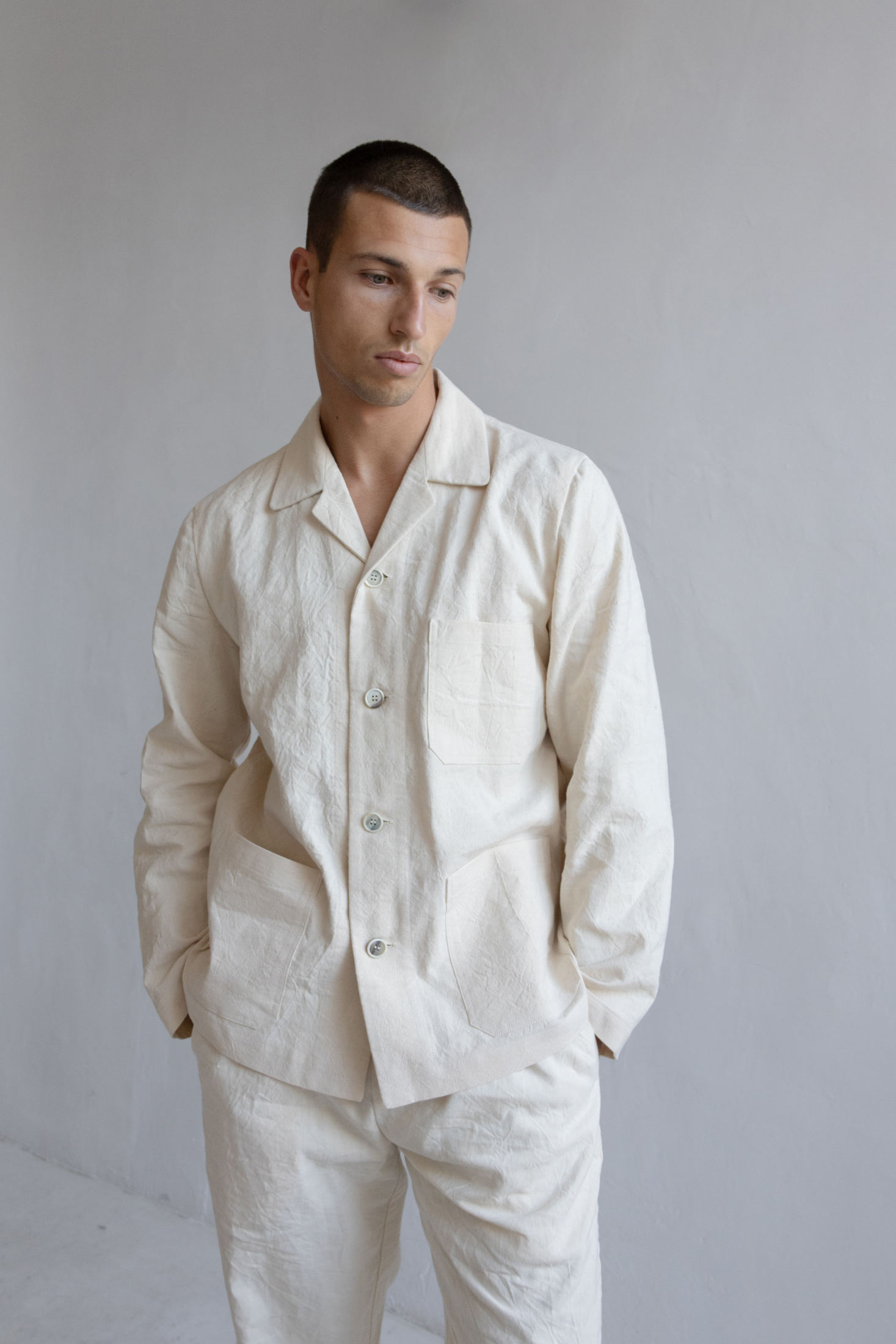 Four-button jacket with a look somewhere between tailoring and a more relaxed fit including three external pockets. For this unique piece, we have chosen a vintage medium weight French Métis fabric in off white. This fabric is new old stock (NOS) sourced from bed sheets in linen / cotton made in the 60s. The buttons are vintage horn buttons from a German manufacturer.
