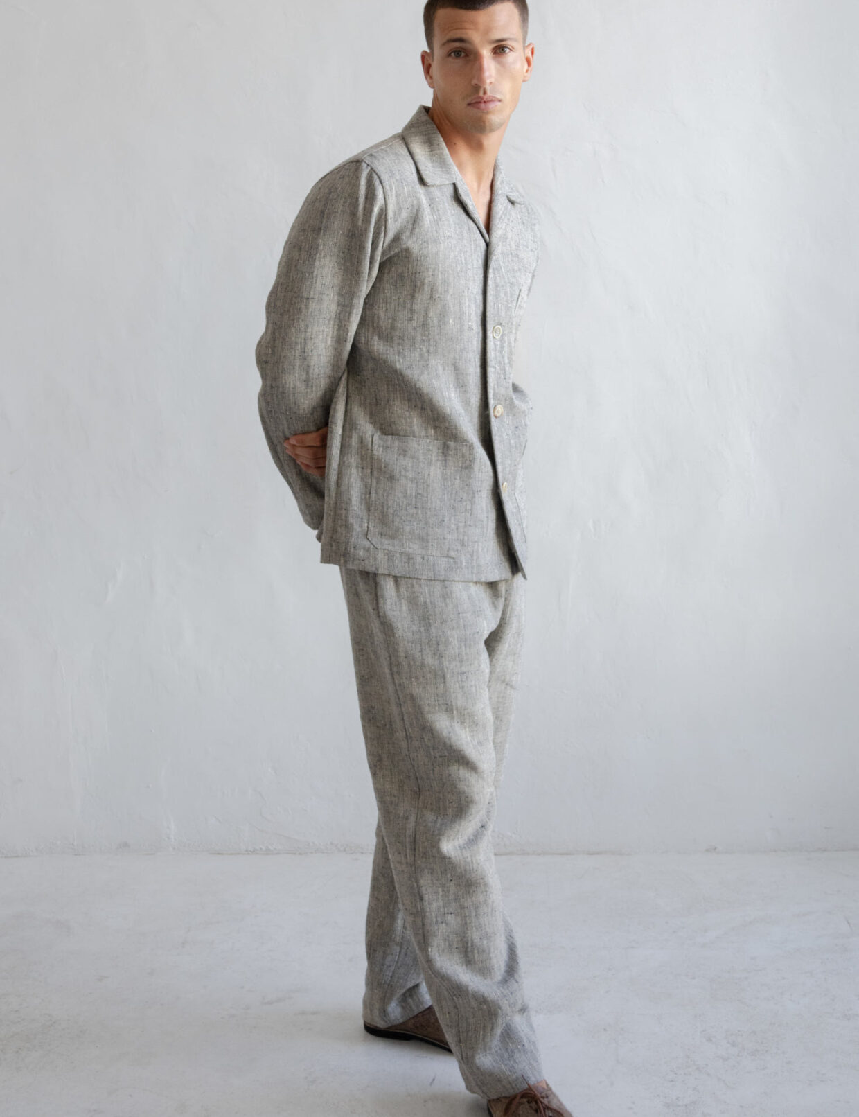 Our jacket has three externals pockets and the sleeve is a manche tailleur mounted the Italian way for a more informal look. Each piece is hand made to order using French seams (coutures lingerie) for a beautiful interior. We also hand embroider each label. This jacket is available in two different fabrics and colours and we have matching pants. This Night & Day jacket was initially designed with a pyjama in mind but turned out to be too elegant to be only worn at night.