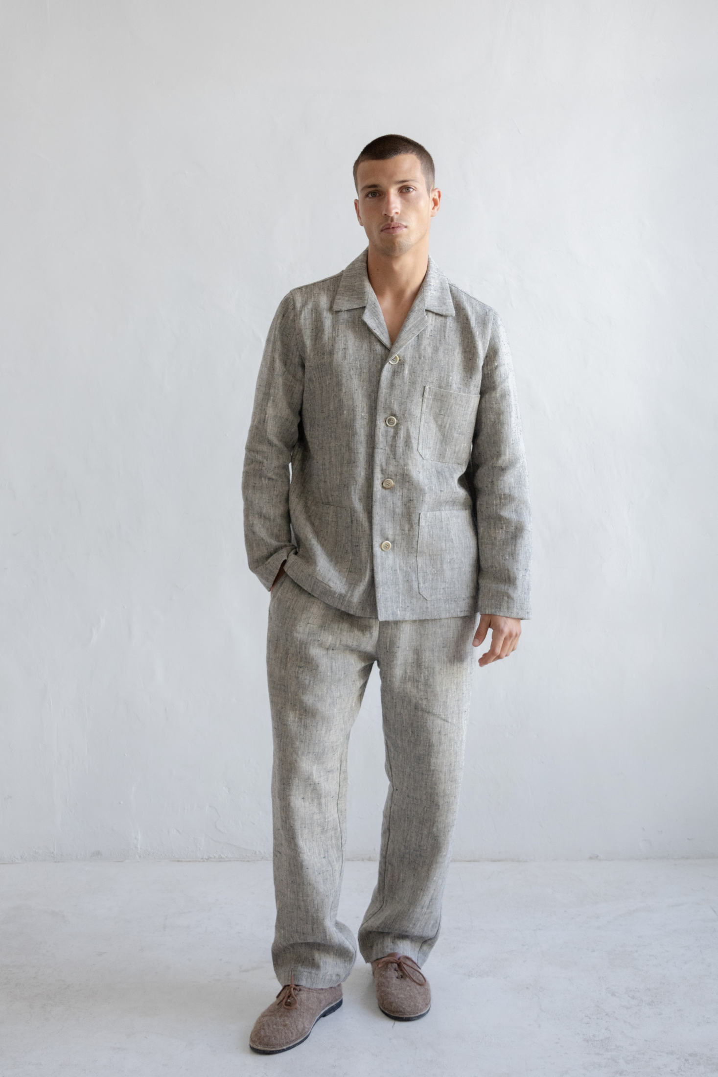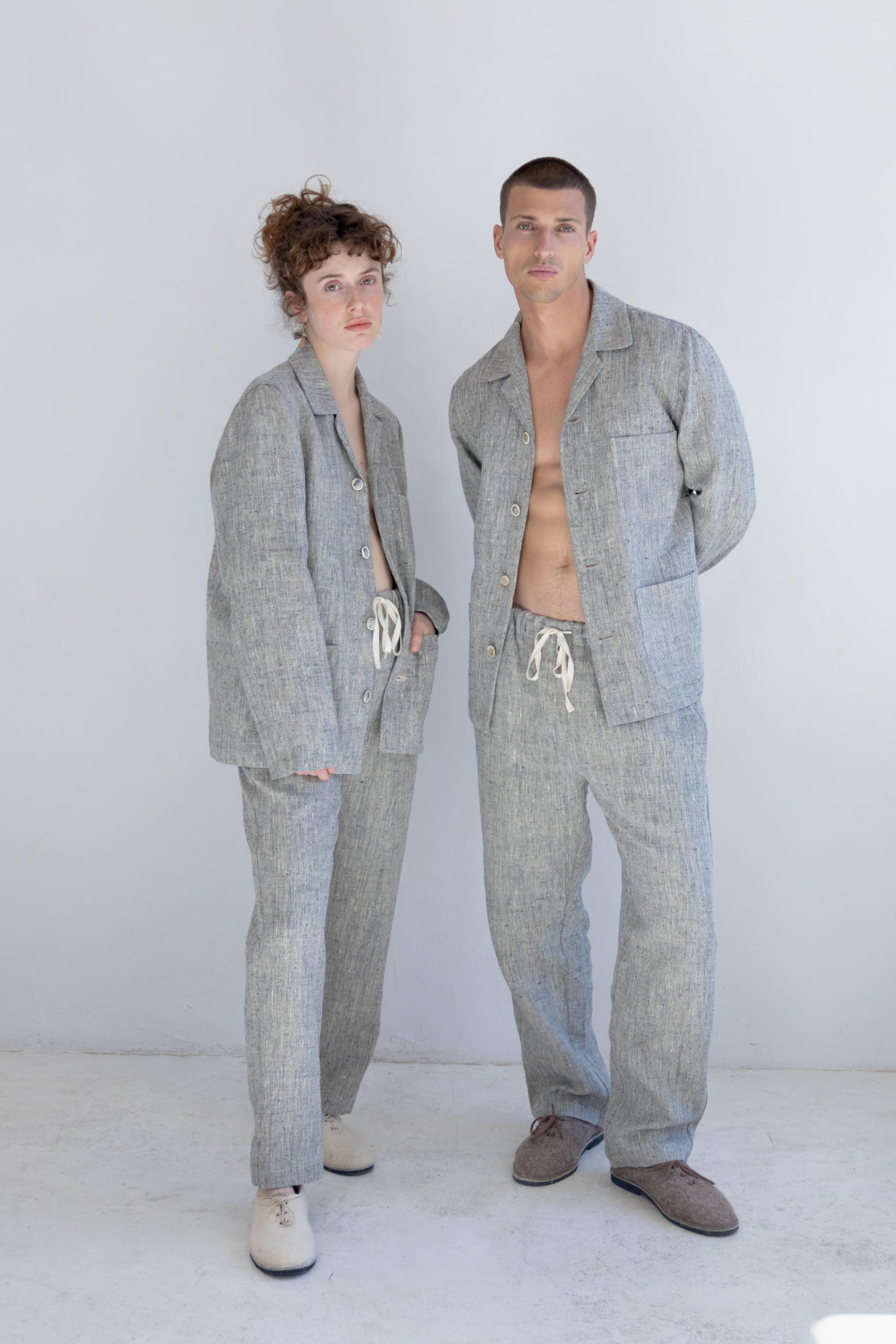 Our pants have two deep side pockets and an elasticated waistband with cotton drawcord. Each piece is hand made to order using French seams (coutures lingerie) for a beautiful interior. We also hand embroider each label. These pants are available in two different fabrics and colours and we have a matching jacket. These Night & Day pants were initially designed with a pyjama in mind but turned out to be too elegant to be only worn at night.