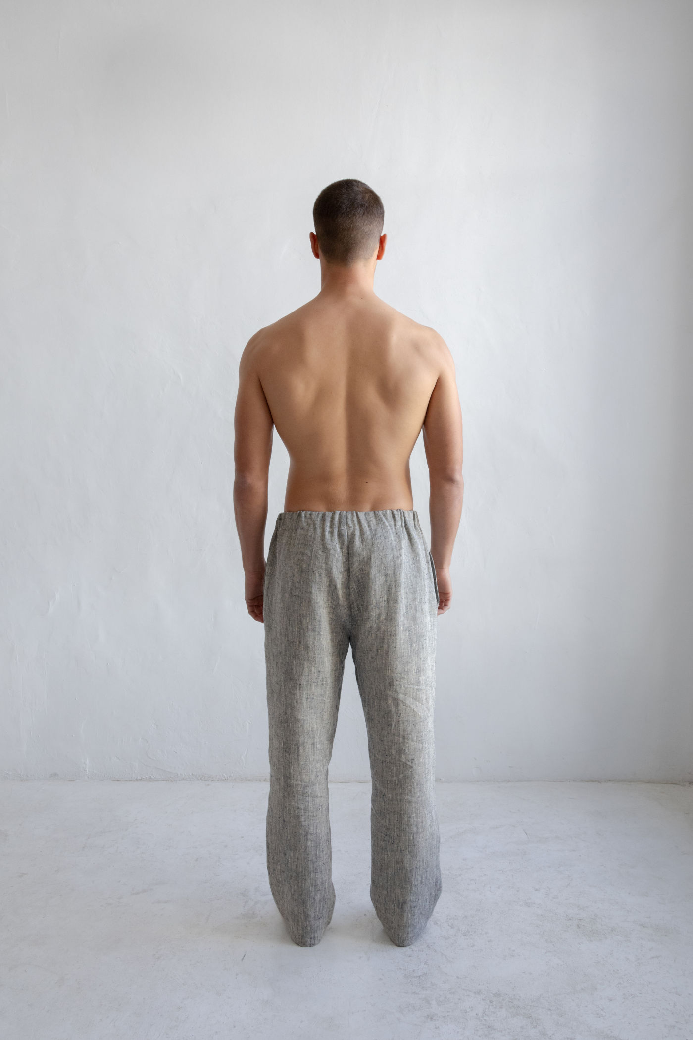 Two deep side pockets and elastic waistband pants. Made using a luxurious heavy hemp fabric made in France in a small factory using old looms. Our pants have a straight leg and relaxed fit. Each garment is hand made to order in our studio. Contact us for approximate delivery time.