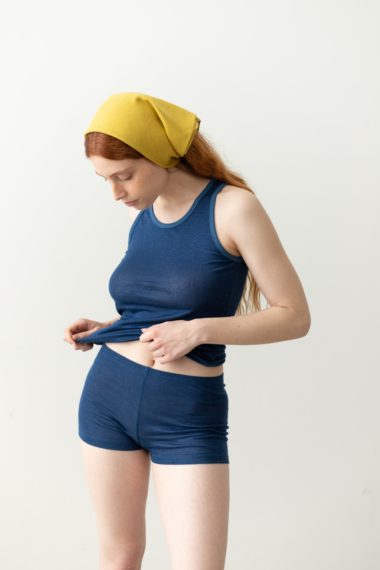 Our mid-rise cut shorty is made from soft jersey linen, a breathable, naturally antibacterial and antifungal material.