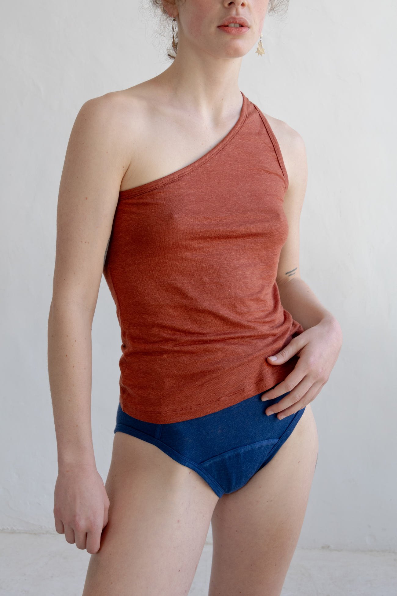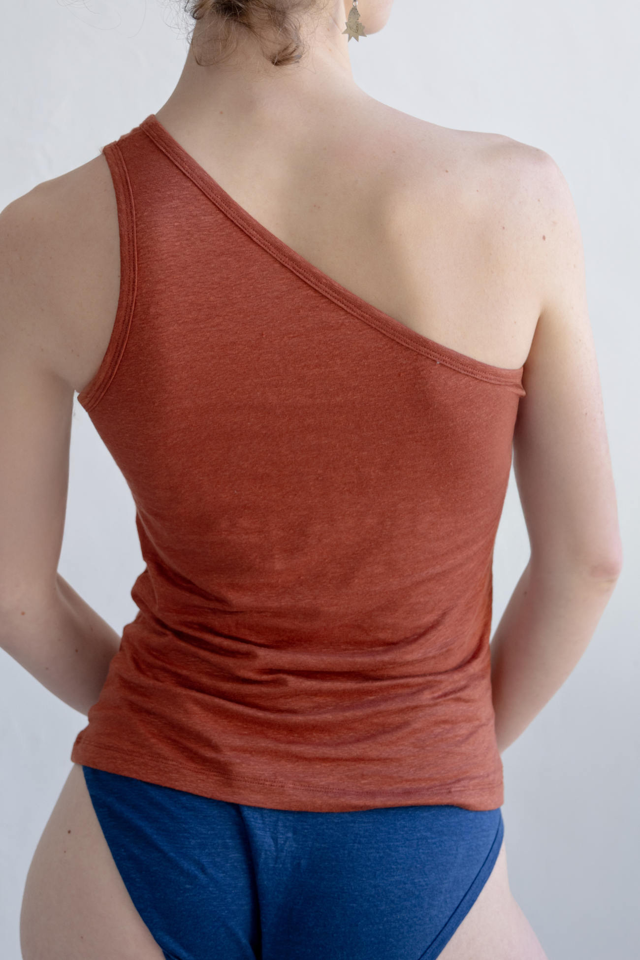 Asymmetrical top to be worn during warmer seasons or for low impact sports such as yoga.